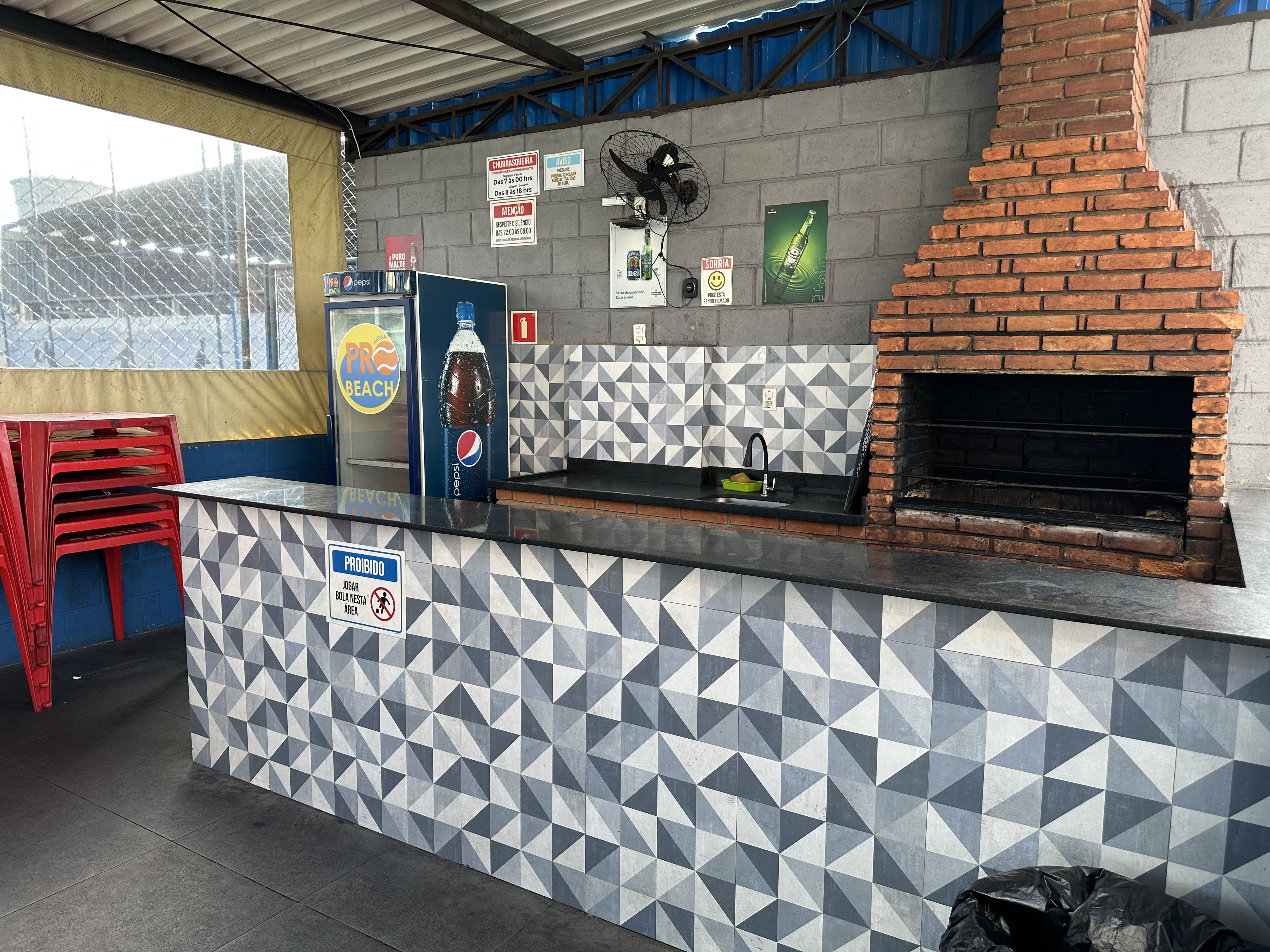 Quadras de futebol, futevôlei, churrasqueira e lanchonete.